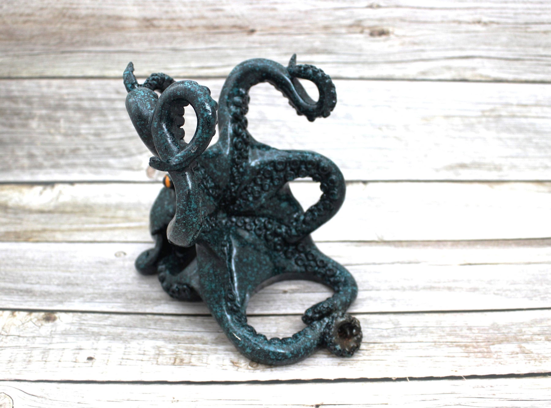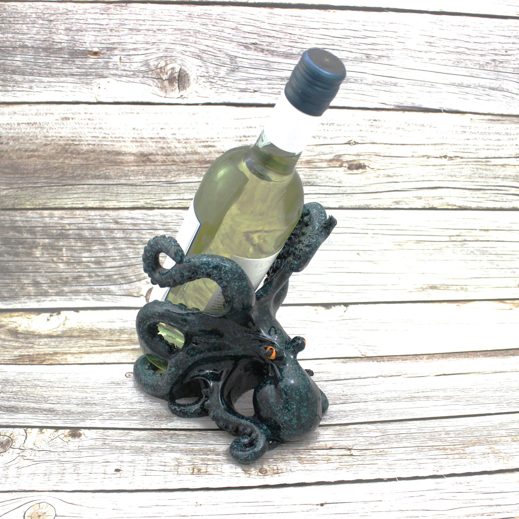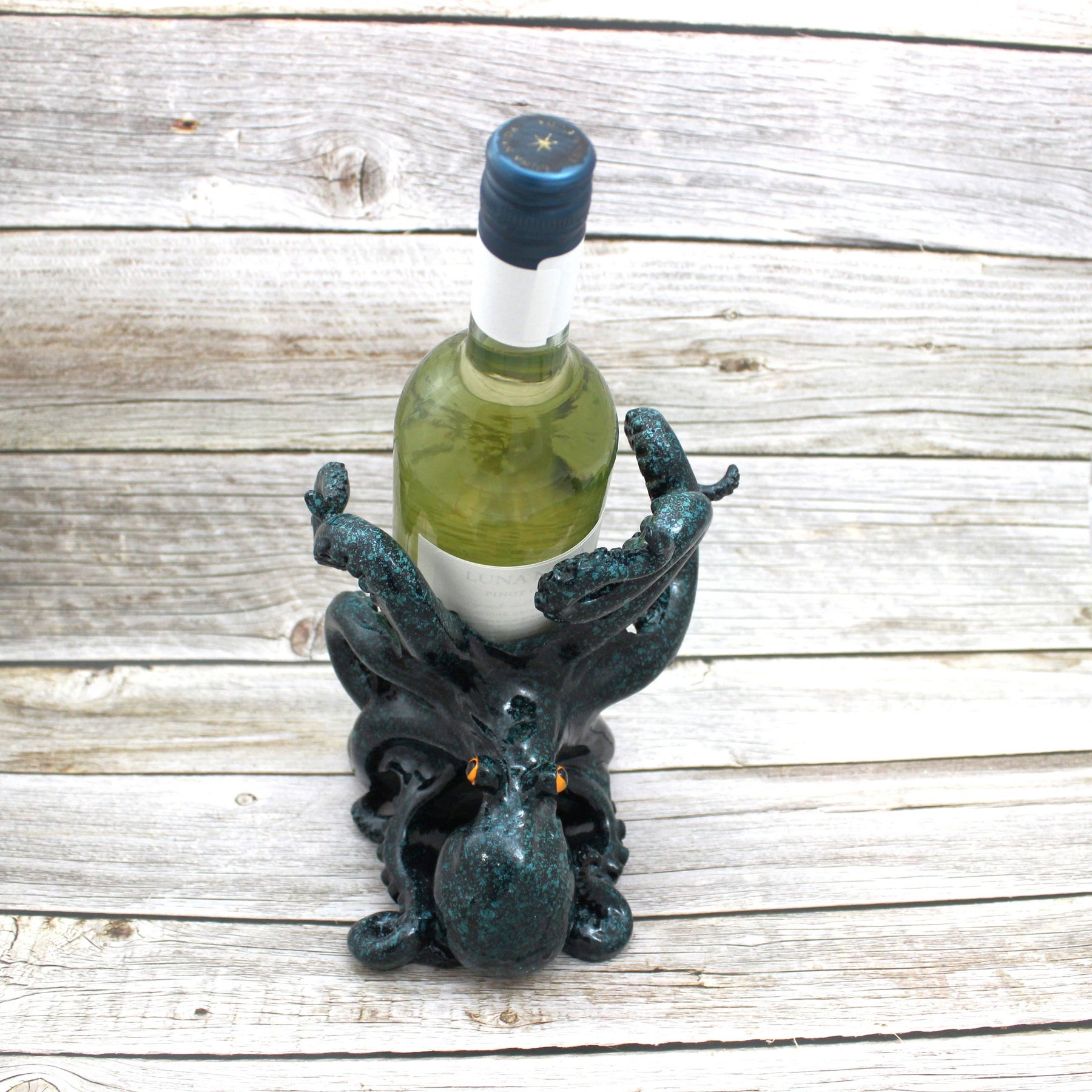 The Octopus Bottle Holder offers a sophisticated addition to any coastal-themed countertop or tabletop. Measuring 8.25" wide by 6.75" deep and 7.5" high, this single wine rack is designed to fit seamlessly into your space. Crafted from designer composite polystone with an enamel finish, each piece is hand-painted and meticulously polished, ensuring a unique and refined centerpiece for wine display.