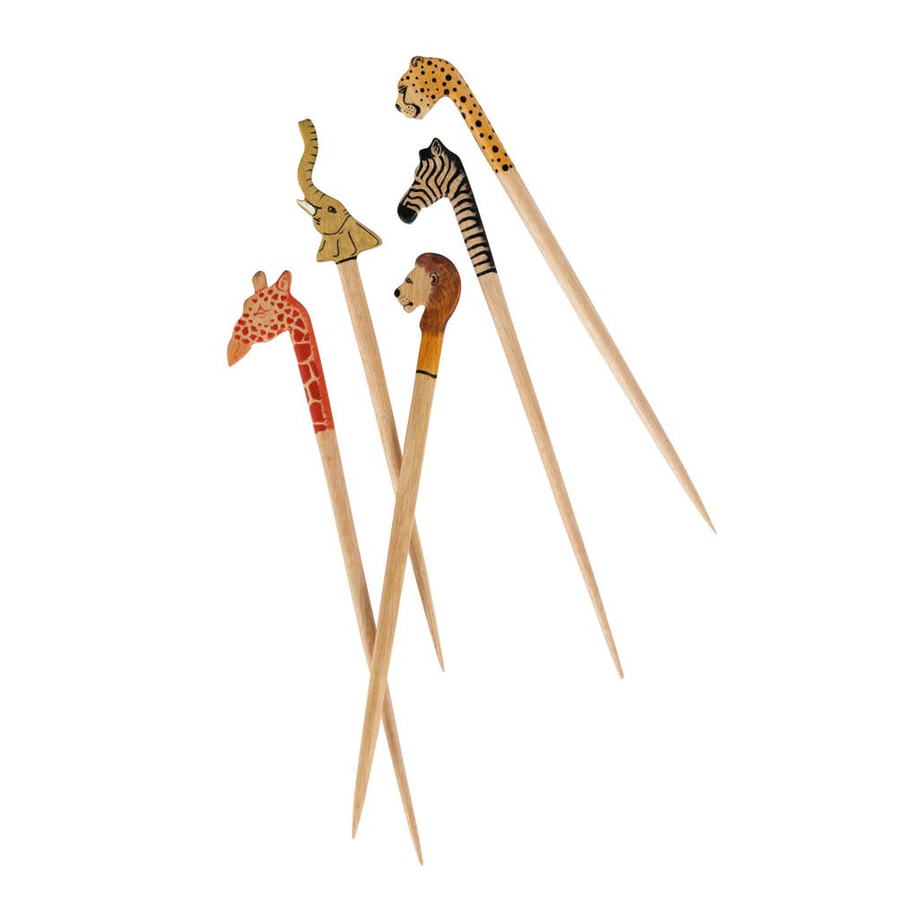Go wild with this set of five party animal stir sticks made from fast-growing jacaranda wood perfect for every type of drink. Not sure who to bring to your next party? Elephant, cheetah, zebra, lion, and giraffe make the perfect host gift. Handcarved and painted by artisans with OTICART in Kenya. * Only available in the US - Materials: Jacaranda wood - Measures: 6.5"L ;Colors: Natural wood, gray, tan, black, brown, reddish orange - Care: Handwash - Notes: Due to nature of naturally-grained jacaranda wood and being handcarved—size, shape or color may vary slightly—making each one entirely unique! Finished with fine vegetable oil. - Hancrafted in Kenya