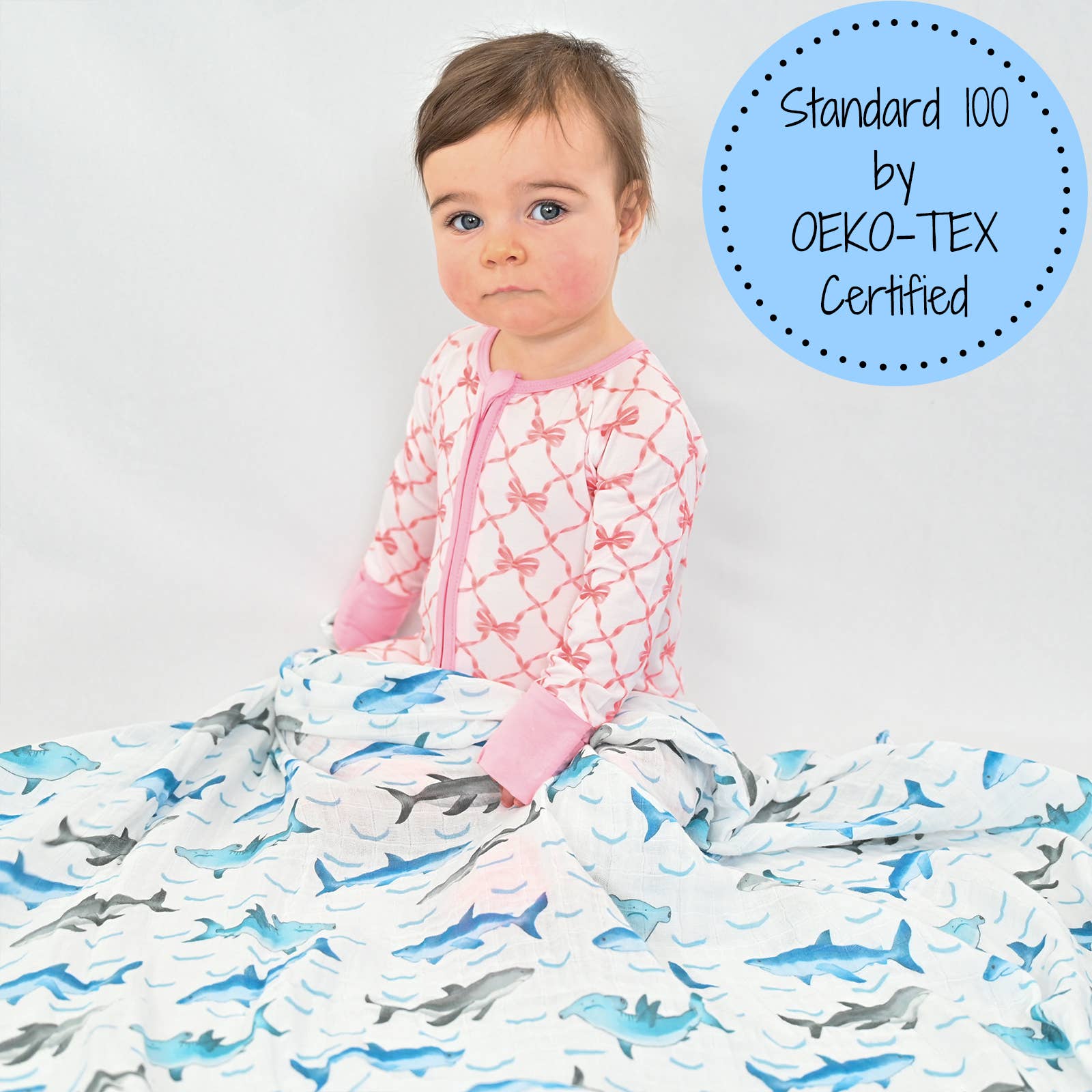 Wrap your baby in the gentle comfort of this 100% cotton muslin swaddle blanket, designed to provide a secure and cozy environment. Measuring 47x47 inches, it offers ample space to snugly swaddle newborns and continues to offer comfort as your child grows. Featuring a delightful shark pattern, it adds a fun accent to any nursery and doubles as a practical stroller cover for outings. Crafted from breathable, lightweight cotton muslin, this durable blanket ensures your baby stays comfortable while lasting through years of use and cherished memories.