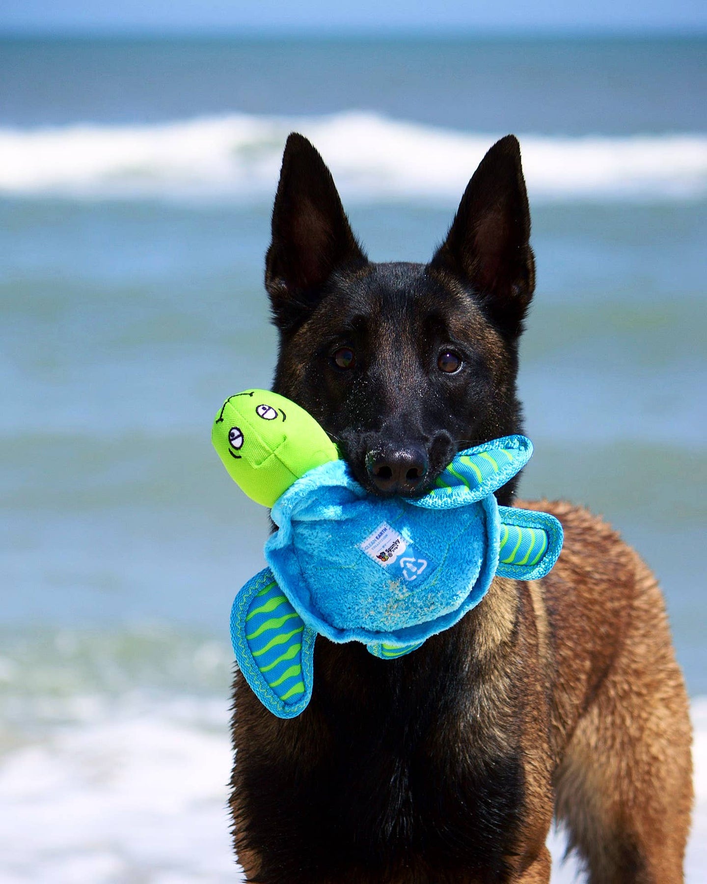 These plush dog toys are crafted entirely from recycled plastic water bottles, including all fabric, stuffing, binding, and thread. Each Turtle Recycled Plush Dog Toy diverts the equivalent of up to nine plastic bottles from polluting oceans, waterways, and landfills. Designed with a built-in squeaker and reinforced for durability, these toys not only promote environmental responsibility but are also fully recyclable after use, supporting an infinite recycling loop. Made from 100% RPET (Recycled Polyester), they combine sustainability with lasting play value.