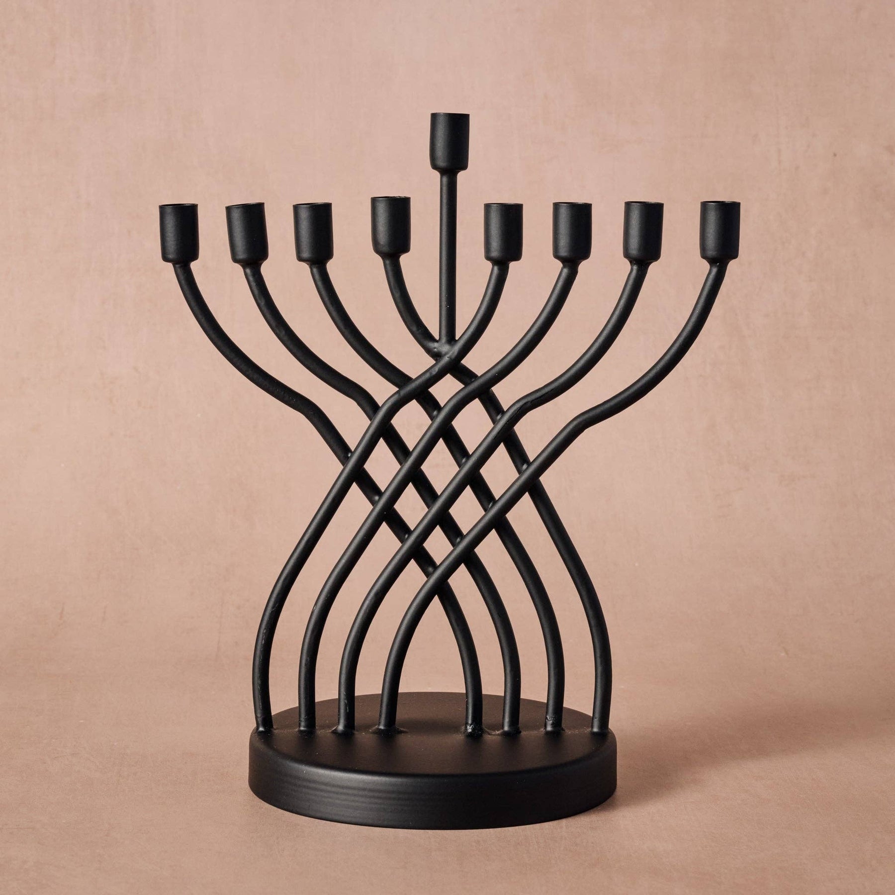 Celebrate the Festival of Lights with bold elegance. Beautifully crafted from sturdy iron and finished with a sleek black powder coating, this menorah features a striking crisscross design where form meets function. Eight evenly spaced candle holders - four on each side - interlace in a woven line, creating a modern silhouette rooted in tradition. A taller central holder rises above the weave to honor the shamash. Timeless, artistic and grounded in meaning, this menorah is a stunning centerpiece for Hanukkah and beyond. A Ten Thousand Villages Exclusive handcrafted in India. Candles not included. Materials: Iron, Black Powder Coating - Measures: 8"L x 8.75"H - Colors: Black - Notes: Candles not included - Handcrafted in India
