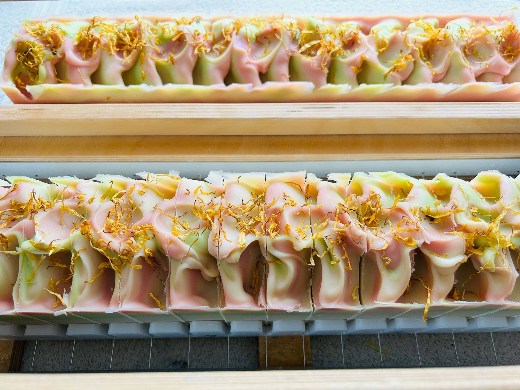 Handmade soap bar that features a floral aroma of a fresh cut bouquet of wildflowers. The soap is topped with beautiful calendula petals. One of our top selling floral soaps!